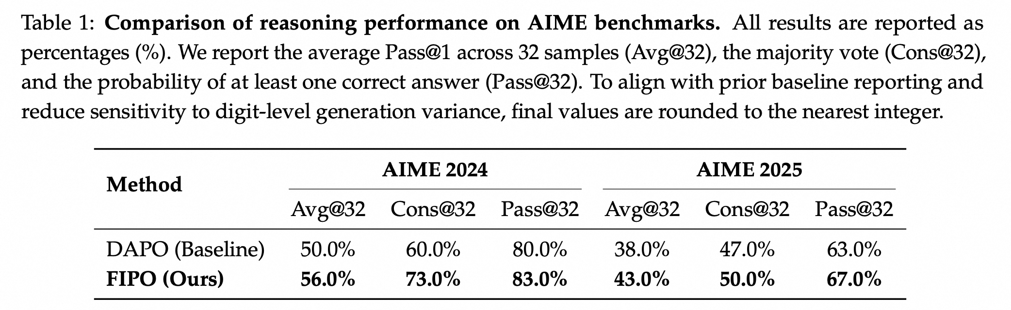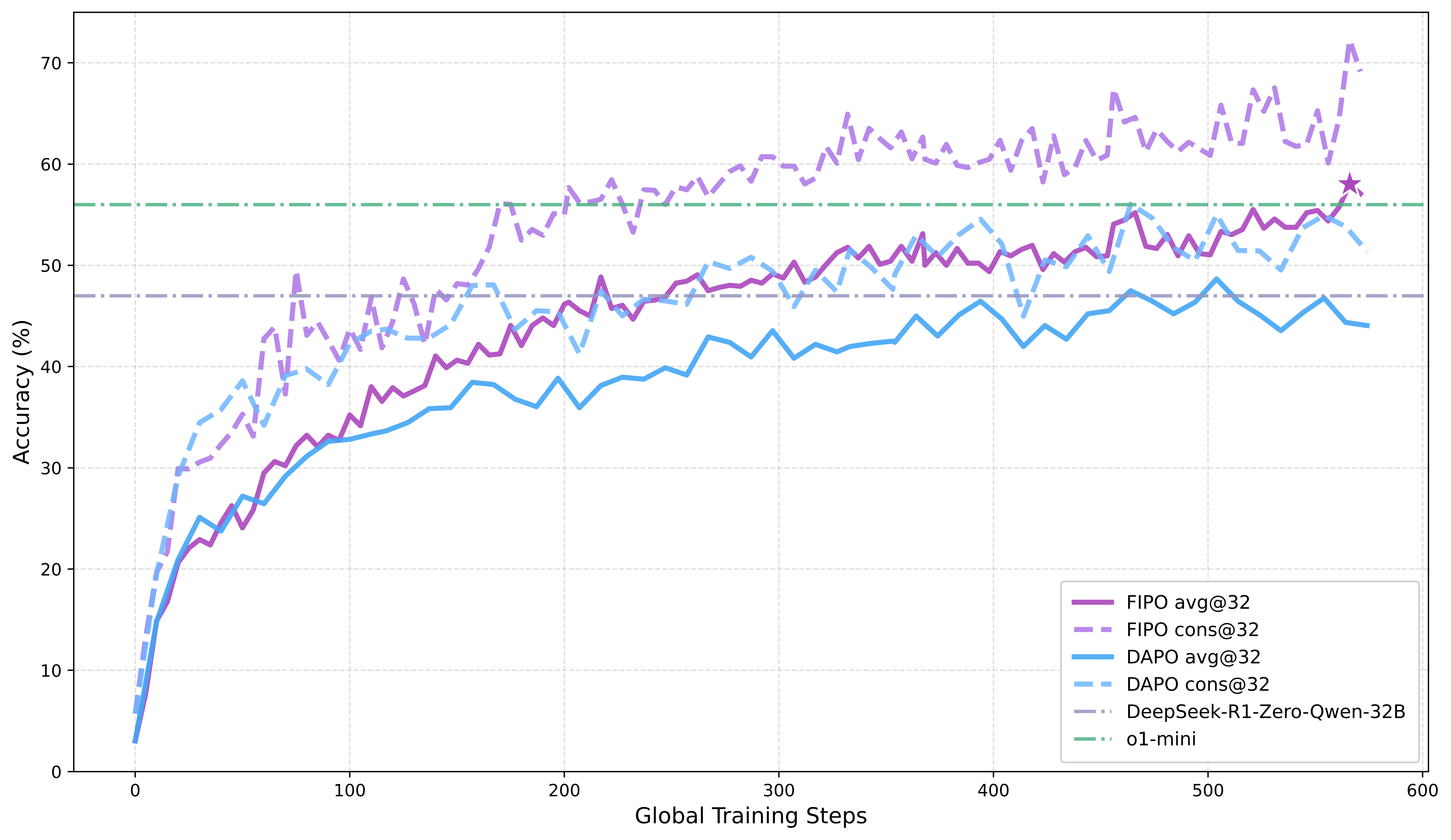 - Pure RL only: FIPO outperforms reproduced DAPO and DeepSeek-R1-Zero-32B, and surpasses o1-mini on AIME 2024.
