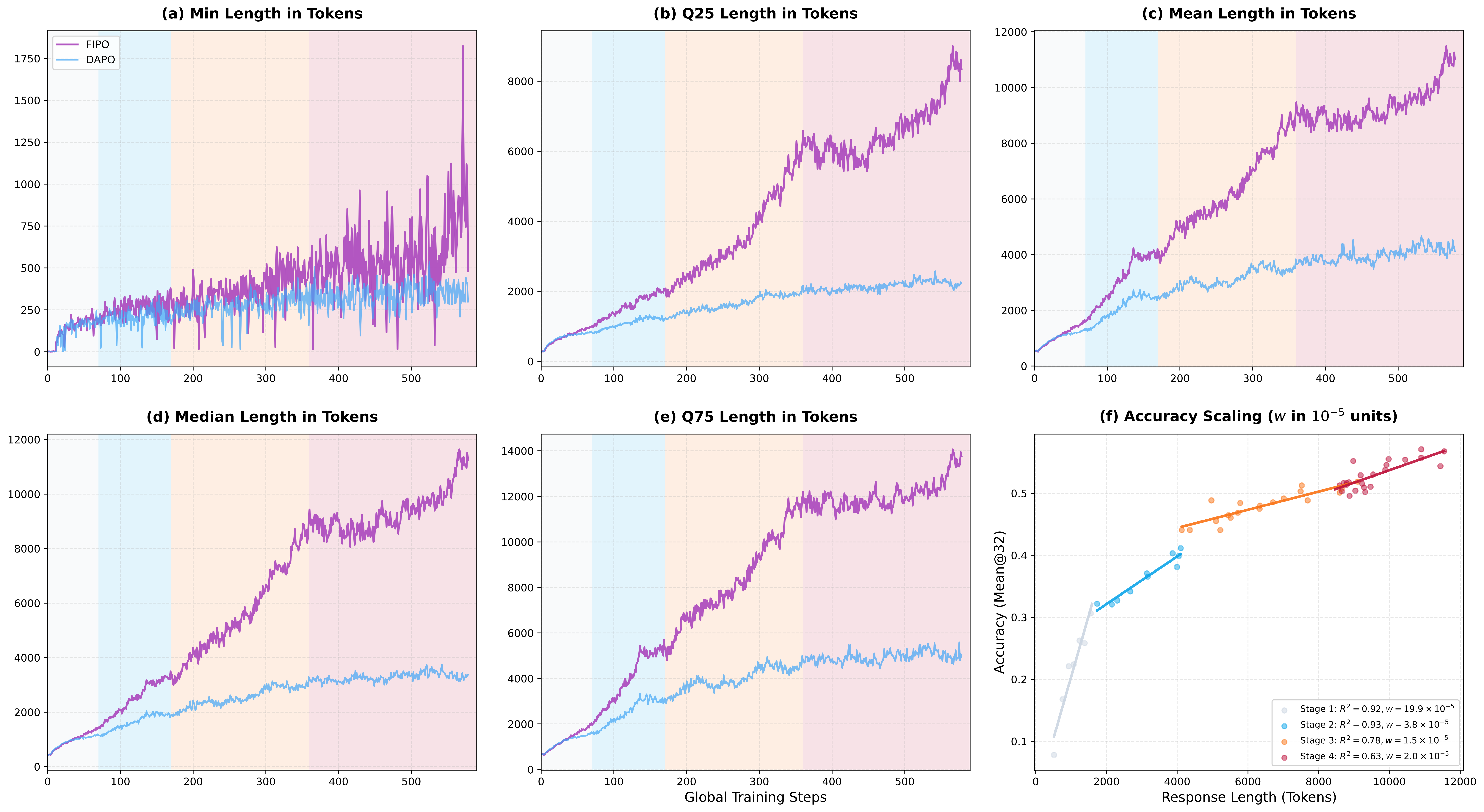 Figure 2. Dynamics of response length and performance scaling during training. Compared to the DAPO baseline, FIPO significantly increases response length and maintains a strong positive correlation between longer chain-of-thought and higher accuracy.